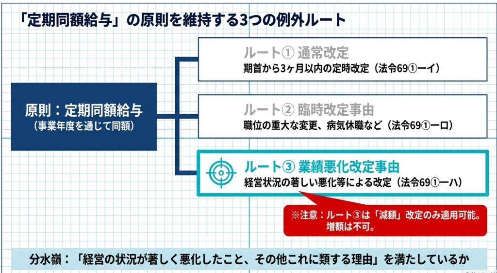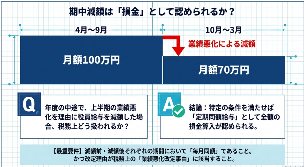 法人税法上、年度途中で役員給与を減額した場合でも、それが「業績悪化改定事由」に該当すれば、改定前後の給与はそれぞれ「定期同額給与」として損金算入が認められます。