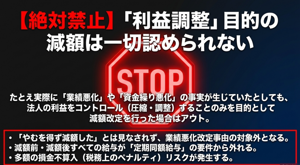 どれほど業績が悪くても、「利益調整のみを目的とした減額」は一切認められません。 決算直前に利益を微調整するために行う遡及的な減額などは論外です。こうした恣意的な操作は、結果として全額損金不算入という最悪の事態を招き、企業のキャッシュフローをさらに圧迫してしまいます。