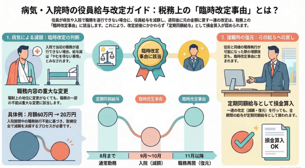 法人税法上、役員が病気入院等のやむを得ない事情により、当初予定されていた職務の一部または全部を執行できなくなった場合、それに伴う役員給与の減額は「臨時改定事由」による改定として認められます。