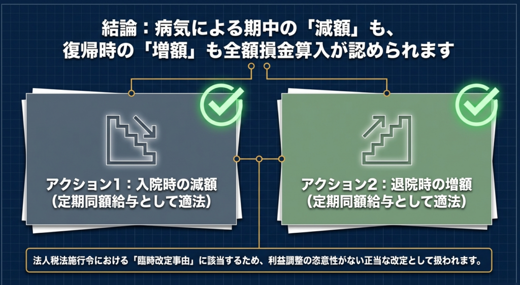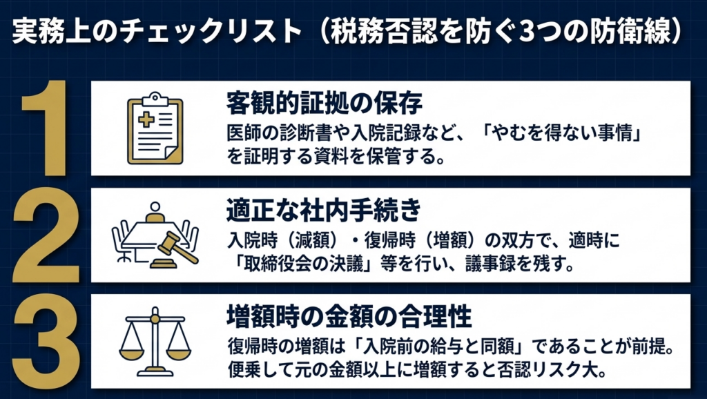 単に「病気だから改定しても良い」という安易な解釈は、税務調査において否認のリスクを招きます。実務担当者は以下の論理構造を堅持してください。