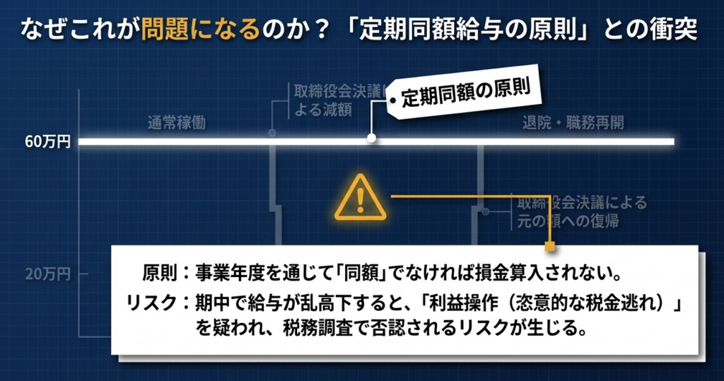 法人税法における「定期同額給与」の原則は、事業年度内における恣意的な利益調整を封じるための極めて強力な規律です。しかし、実務上、役員の病気や入院といった予測不可能な事態は、単なる「健康問題」に留まらず、企業の税務リスクを左右する「職務執行の不全」という重大な経営上の事象へと発展します。