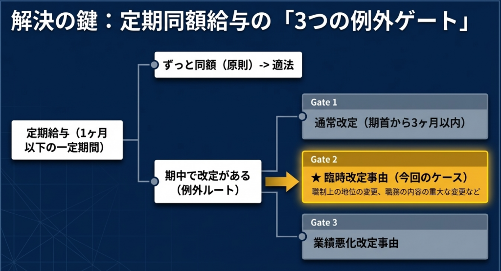 実務上のポイントは、復職後の増額についても「職務の内容の重大な変更」に該当すると判断されている点です。