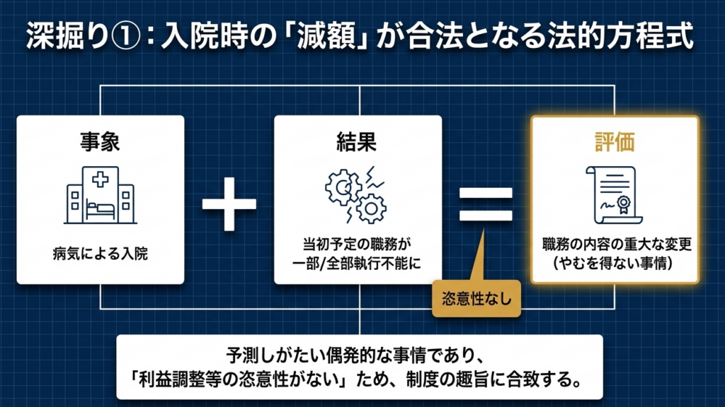 代表取締役という地位に変動がなくとも、入院によって「当初予定されていた職務の一部または全部の執行が不能」となった事実は、実質的な職務内容の重大な変更に他なりません。 - 偶発性による利益調整の否定: