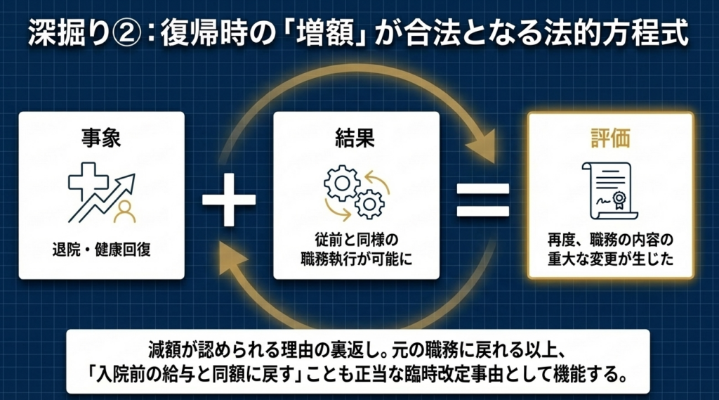 減額が「職務の減少」に起因するように、復職による給与の復元は「職務の回復」という、やはり重大な変更を伴う事象です。この双方向の対称性が認められることで、利益調整の恣意性が排除された一貫性のある改定として、損金算入の妥当性が担保されます。