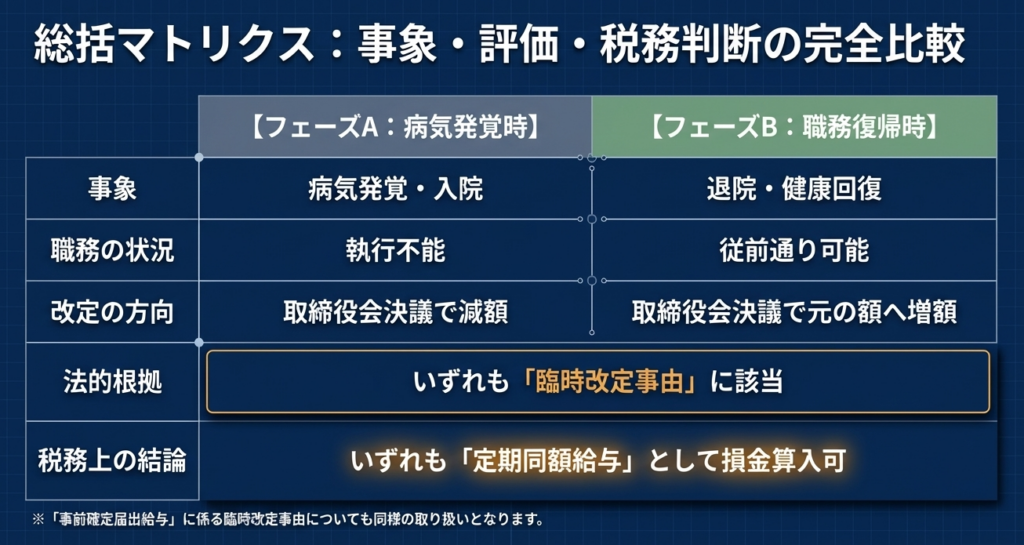 企業の税務リスク管理において、職務執行が不可能な状態になった際に行う給与改定は、単なる「優遇」や「救済」ではなく、実質的な職務の内容の変化に即した「合理的な価格修正」と捉えるべきです。この論理的整合性が担保されて初めて、年度中途の改定であっても「臨時改定事由」として全額損金算入が認められます。