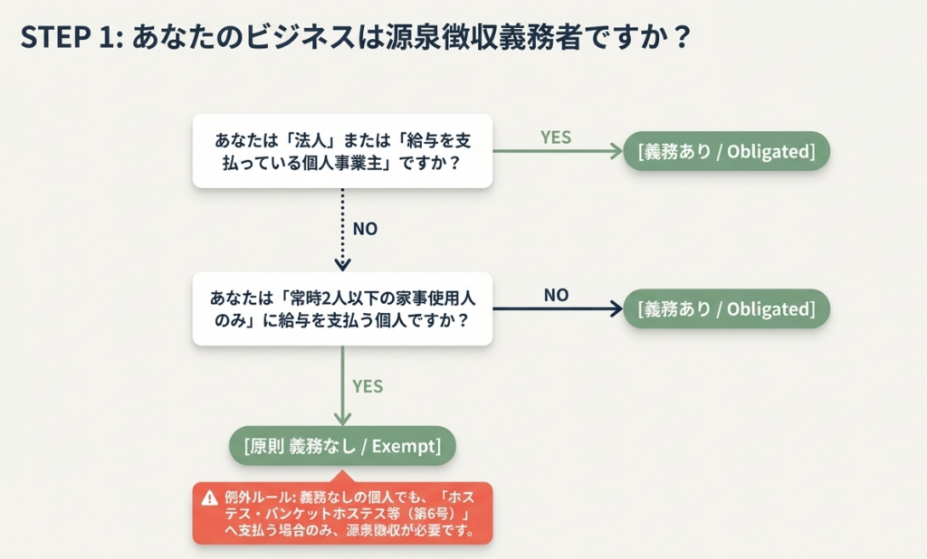 支払者が個人であり、その個人が給与の支払者でない場合、または常時2人以下の家事使用人のみに対する給与の支払者である場合に限られる。ただし、この場合でもホステス等への報酬については源泉徴収が必要となる。