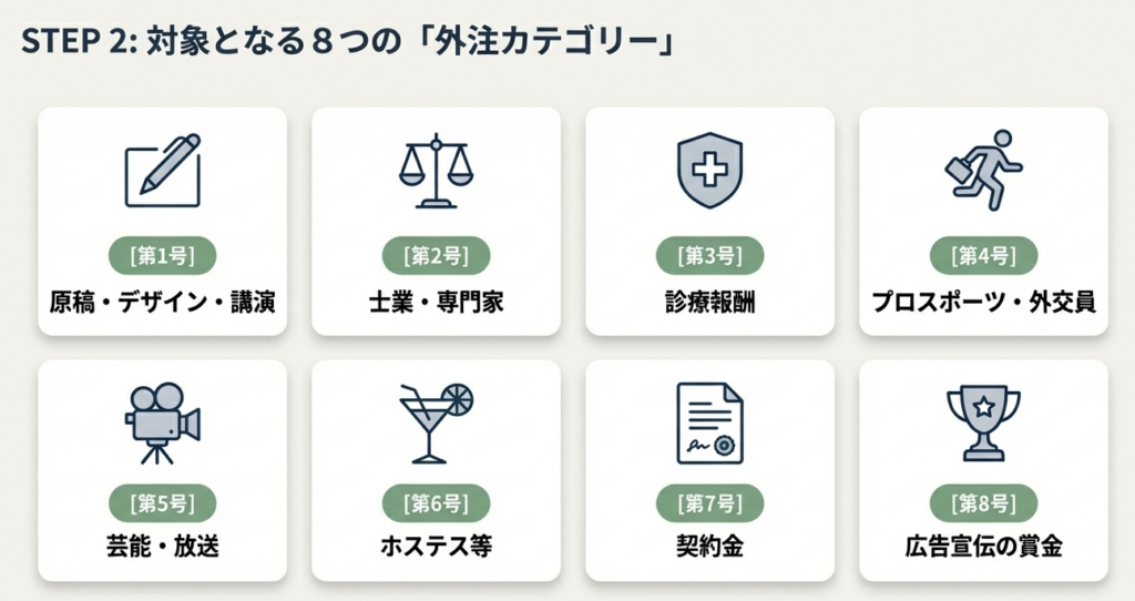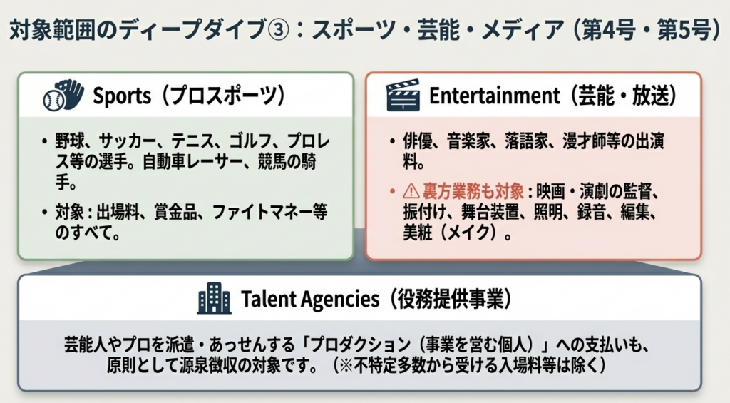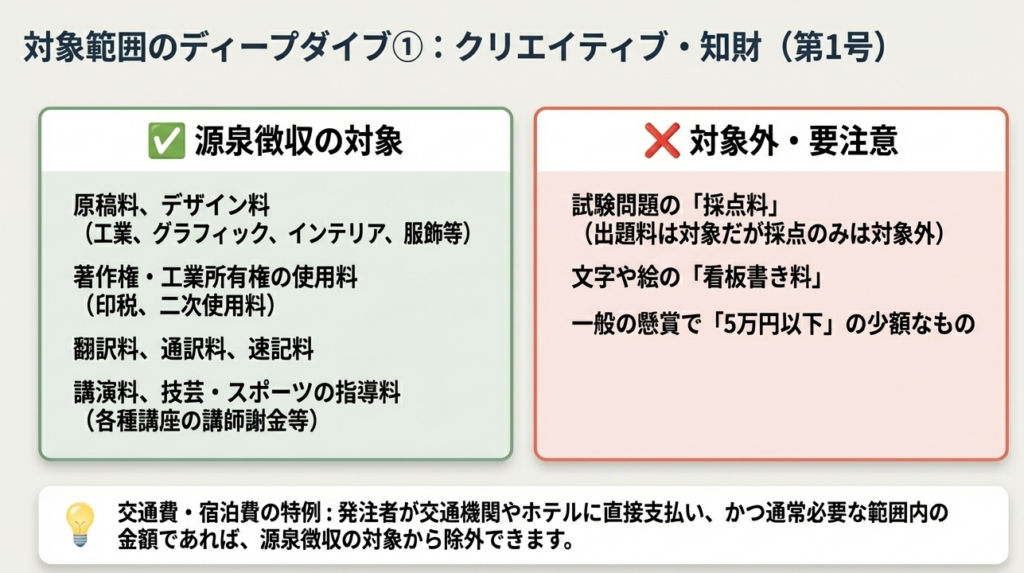 実務で最も誤解が多い点ですが、「5万円以下の免除」は全ての報酬に適用されるわけではありません。 所得税法第204条第1項第1号のうち、以下の3点に厳格に限定されます。