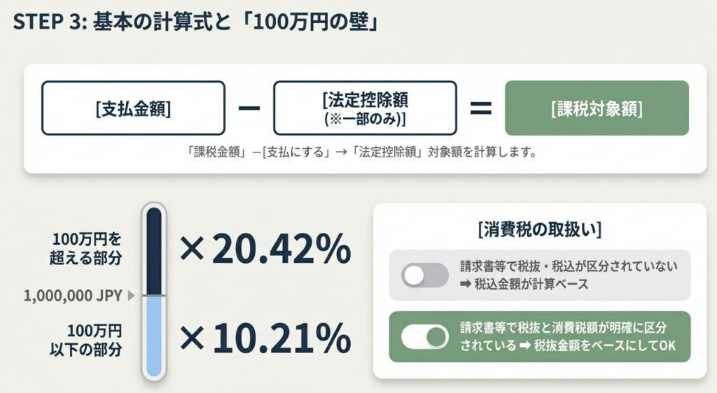 原則として支払額(100万円超は超過分20.42%)に対し、10.21%を乗じて算出します。納付は支払月の翌月10日がデッドラインです。