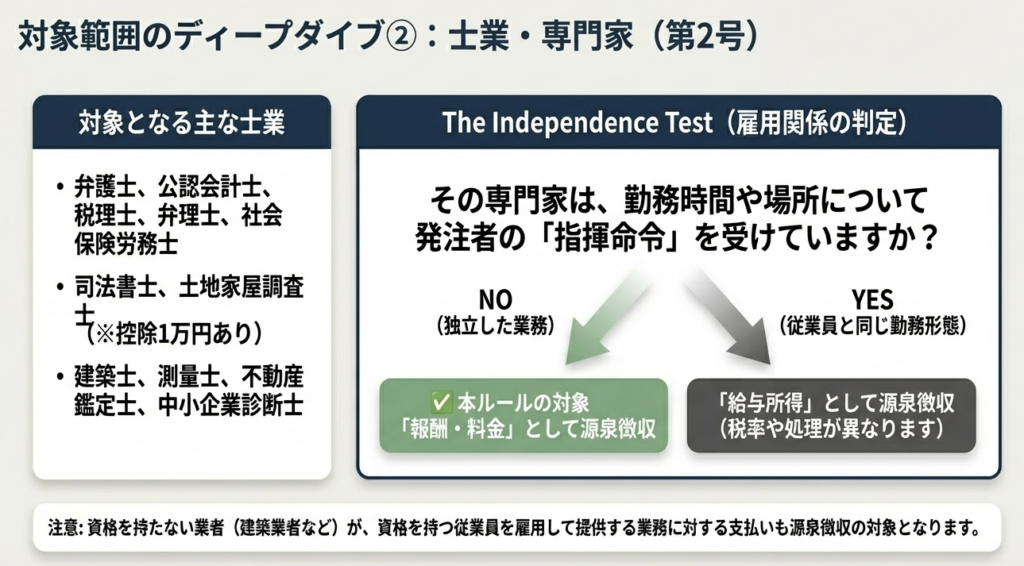 | 第2号:専門家報酬 | 弁護士、公認会計士、税理士、中小企業診断士等の業務報酬 | 同上 | 指揮命令下にあり、一般従業員と勤務形態に差異がない場合の給与所得 |