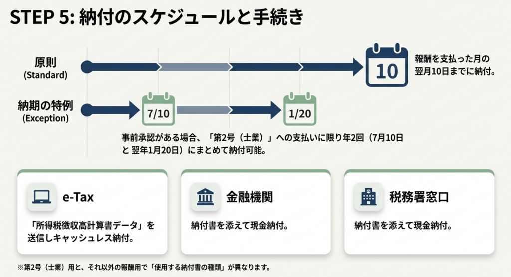 報酬・料金を支払った月の翌月10日までに、最寄りの金融機関または所轄税務署の窓口、あるいはe-Taxによるキャッシュレス納付にて納付しなければならない。