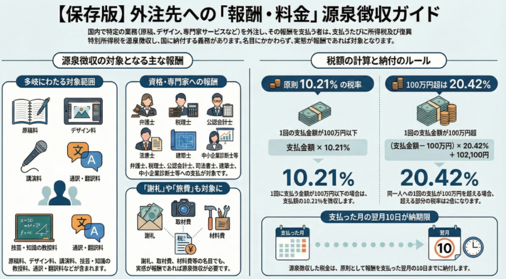| 区分 | 主な該当例(源泉対象) | 源泉徴収税額の計算式 | 類似するが【対象外】のもの |