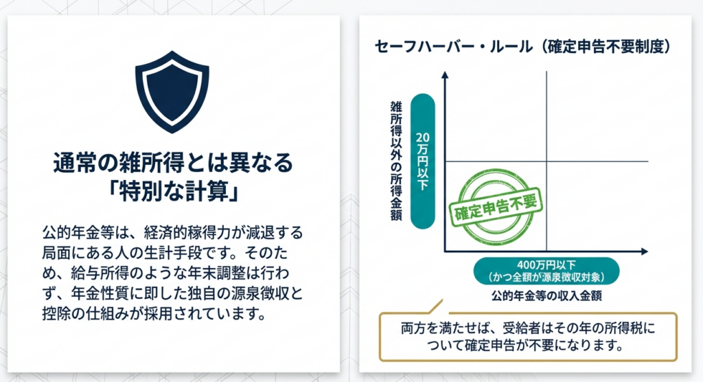 実務上、公的年金等に係る所得税の取扱いは、一般的な給与所得や他の雑所得とは一線を画す独自の体系を持っています。公的年金は、受給者が現役を退き経済的稼得力が減退する局面において、その生計を維持するための重要な手段であるという特殊な性質を有しています。この「生計維持」という目的を考慮し、税制面でも通常の雑所得とは異なる計算方法が採用されています。
