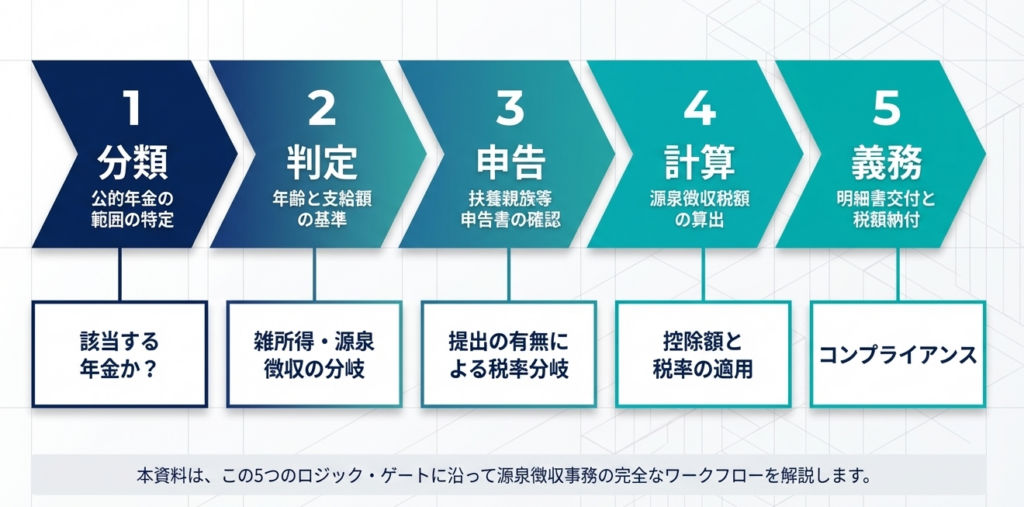 会計実務の視点から特に留意すべきは、源泉徴収の仕組みが給与所得と決定的に異なる点です。公的年金等の支払においては、給与所得のような「年末調整」の仕組みが存在しません。