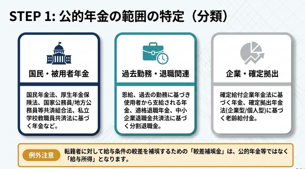 実務において「公的年金等」として取り扱うべき主要な範囲は以下の通りです。
