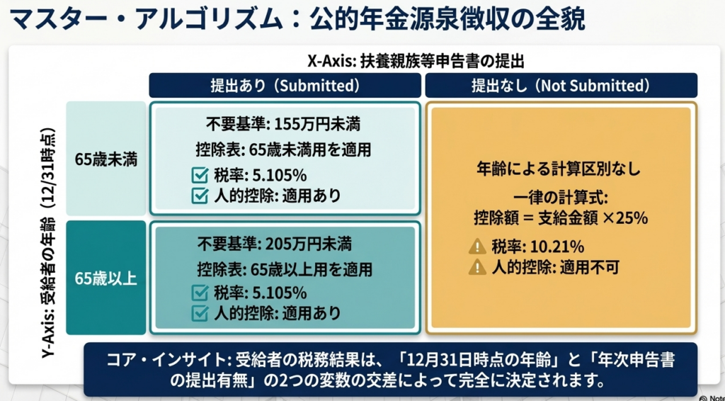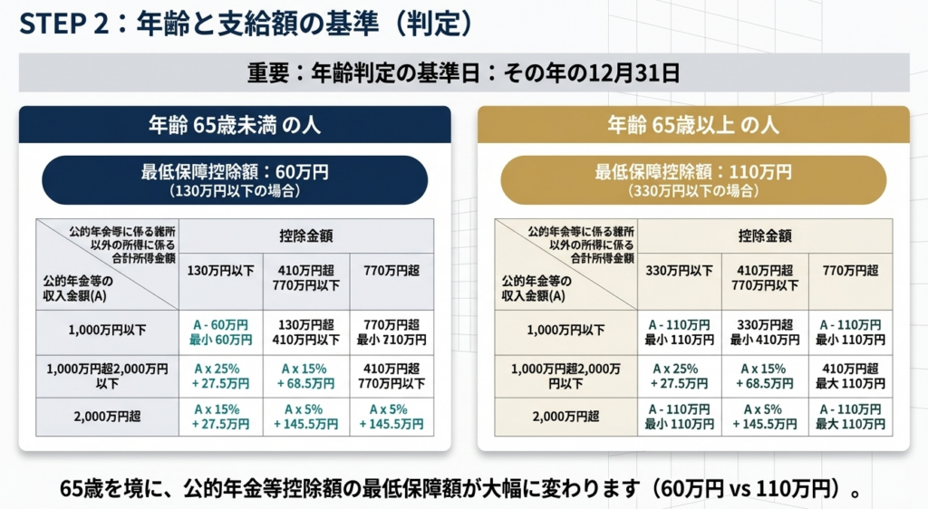 公的年金等の所得計算は、受給者の「年齢」および「他の所得水準」によって控除額が変動する多層的な構造となっています。