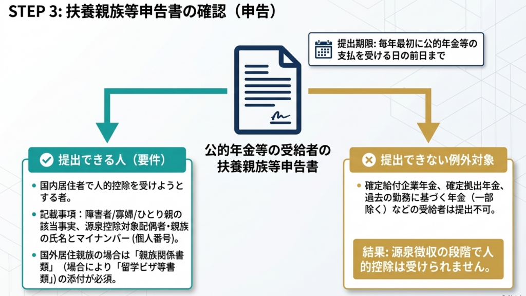 扶養親族等申告書は、原則として提出期限の属する年の翌年1月11日から7年間保存しなければなりません。また、国外居住親族に係る人的控除の適用には「親族関係書類」等の添付が厳格に義務付けられており、確認を怠ると過少徴収リスクを招きます。 - 支払明細書の交付と罰則