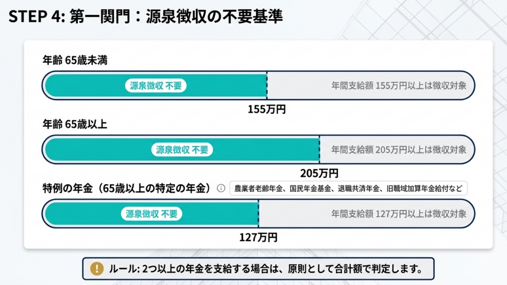 受給者の年齢判定は、その年の12月31日における現況により行われます。この判定により、公的年金等控除額の算出や源泉徴収を要するかどうかの基準額(155万円、205万円等)が決定されます。
