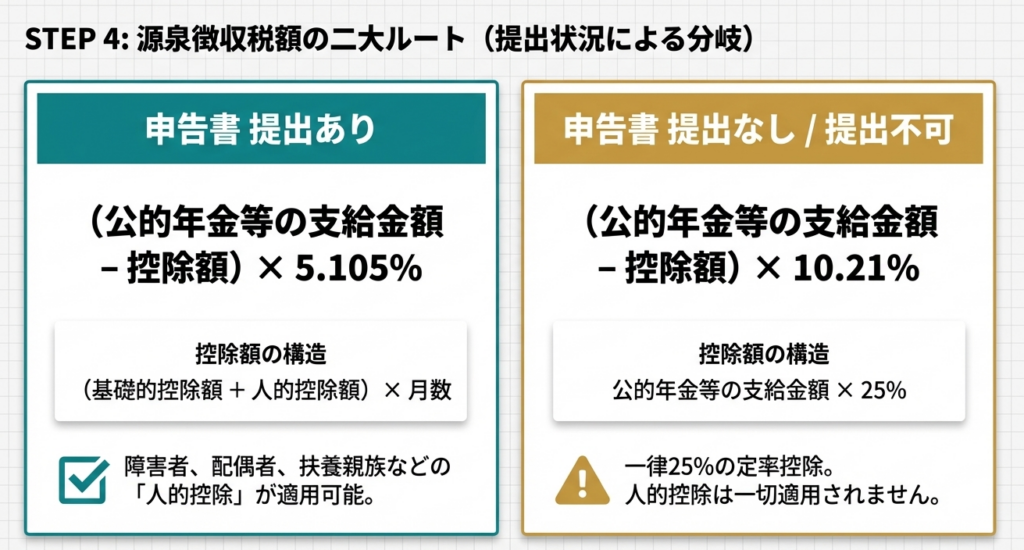 申告書がある場合のみ、人的控除(配偶者、扶養親族等)の適用が受けられます。未提出の場合は人的控除が適用されず、税率も高くなるため、受給者の手取額に大きなインパクトを与えます。