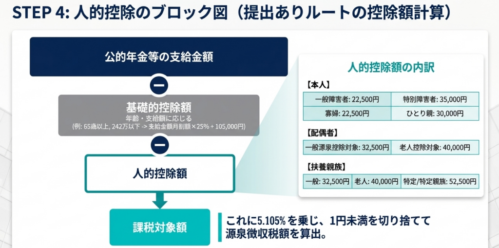 計算式は「(公的年金等の支給金額 - 控除額) × 5.105%」となります。ここでいう控除額は、「(基礎的控除額 + 人的控除額) × 月数」で算出され、1円未満の端数は切り捨てます。