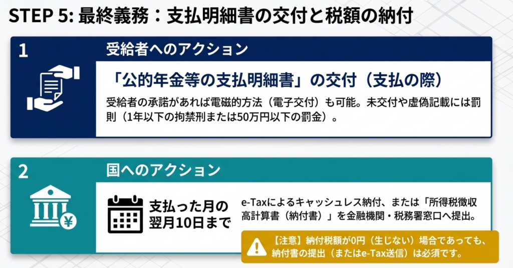 納付期限は、公的年金等を支払った月の「翌月10日」までです。たとえ納付すべき税額が生じない場合であっても、所得税徴収高計算書(納付書)を所轄税務署へ提出(またはe-Taxで送信)する必要があります。