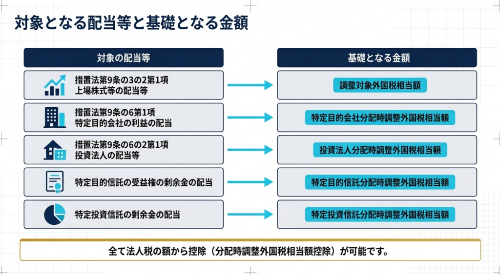 | 全額控除対象 | 合同運用信託、公社債投資信託、公社債等運用投資信託(特定を除く) | 分配時調整外国税相当額の全額 |