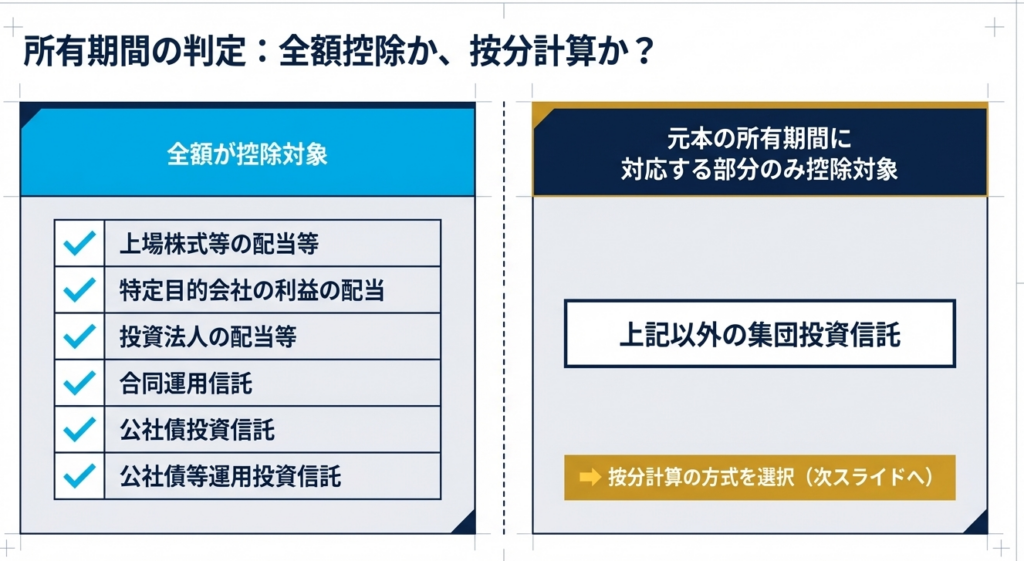 実務上の最大の判別ポイントは、元本の所有期間に基づく案分計算が必要かどうかです。