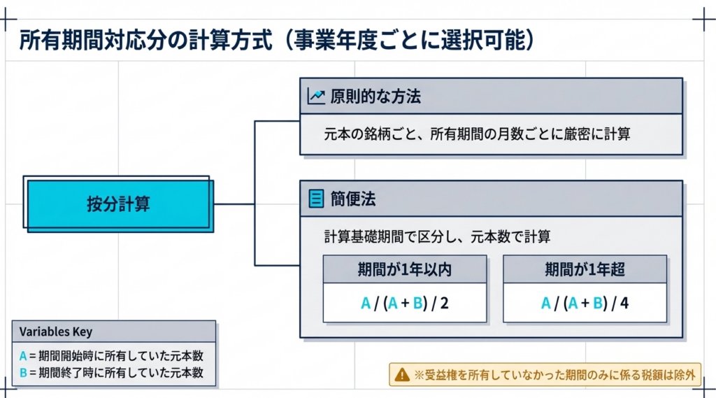 控除対象額は、一部の集団投資信託を除き、原則として元本の「所有期間に対応する部分」の額のみとなります。所有期間対応分の計算方法には「原則的な方法」と「簡便法」があり、事業年度ごとに選択可能です。