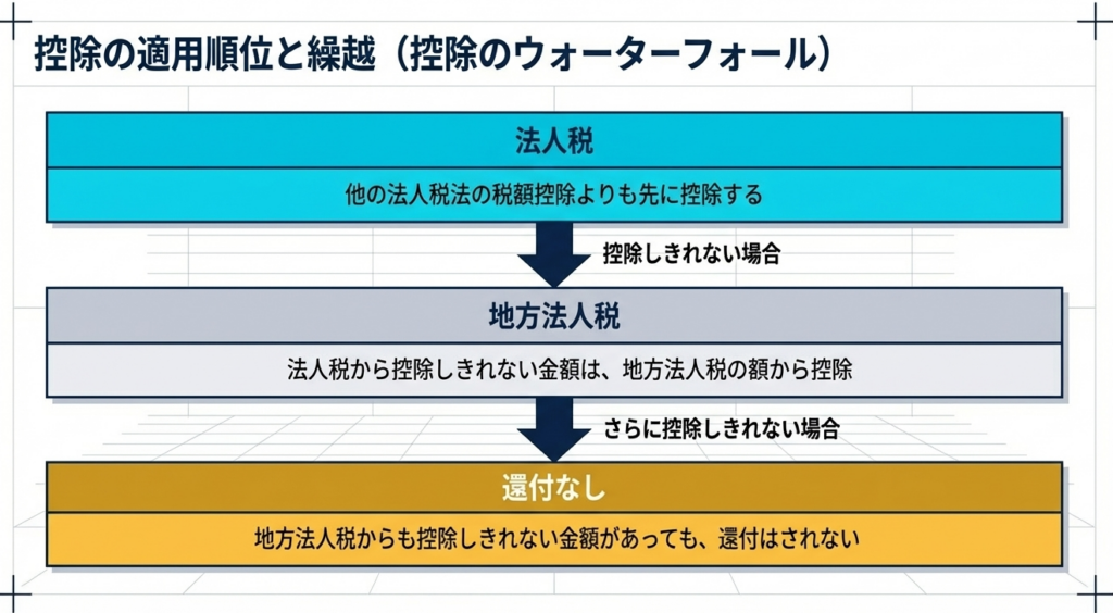 この控除は他の税額控除よりも優先して適用され、法人税から控除しきれない分は地方法人税から控除されますが、それでも控除しきれない金額があっても還付はされません。