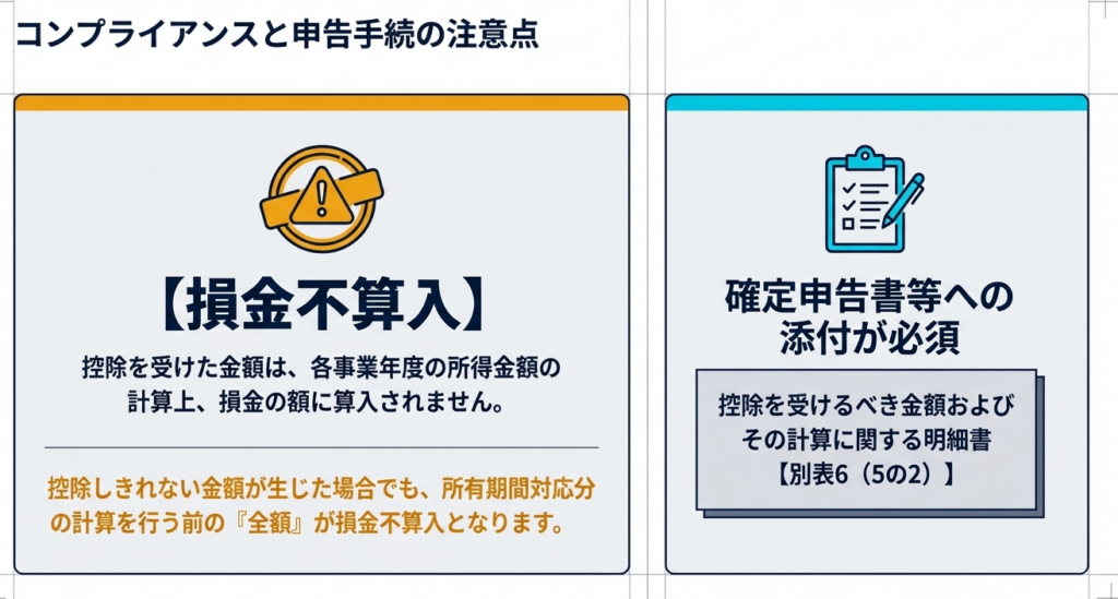 適用には確定申告書(別表6(5の2))への記載と添付が必要であり、控除を受けた金額は各事業年度の所得計算において経費(損金)に算入されません。