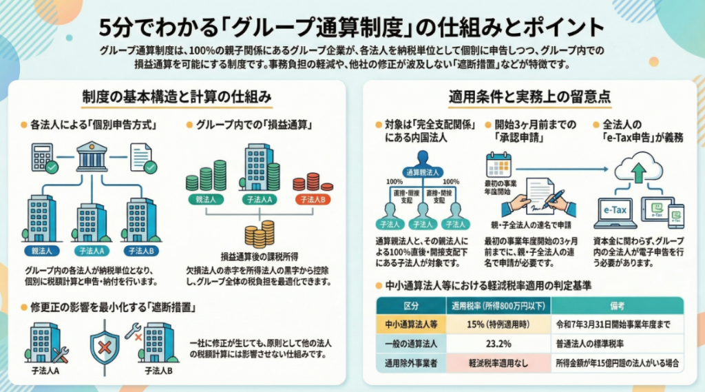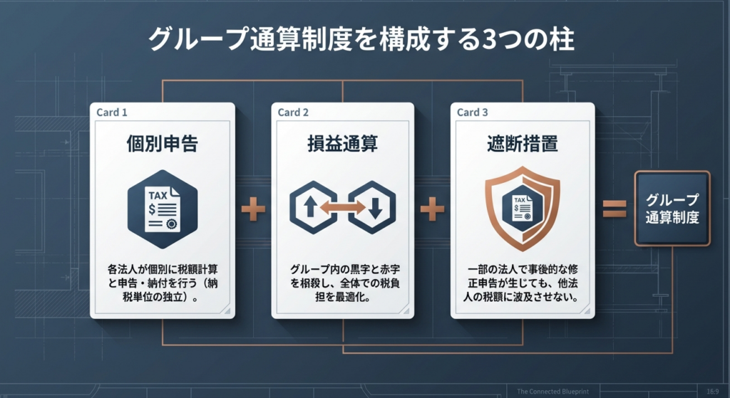 完全支配関係にある企業グループ内の各法人を納税単位として、各法人が個別に税額計算と申告を行い、その中で損益通算等の調整を行う制度です。後発的な修更正事由を他の法人の税額に反映させない遮断措置や、組織再編税制と整合的な時価評価課税などの仕組みを備えています。