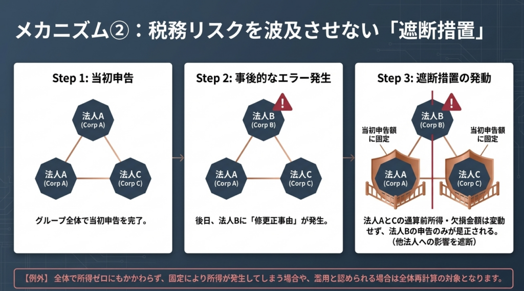 この際、最も特筆すべきは「遮断措置」の導入です。これは、一部の法人に後発的な修更正事由が生じても、原則として他の法人の税額計算には影響を及ぼさない(当初申告額に数値を「固定」する)仕組みです。