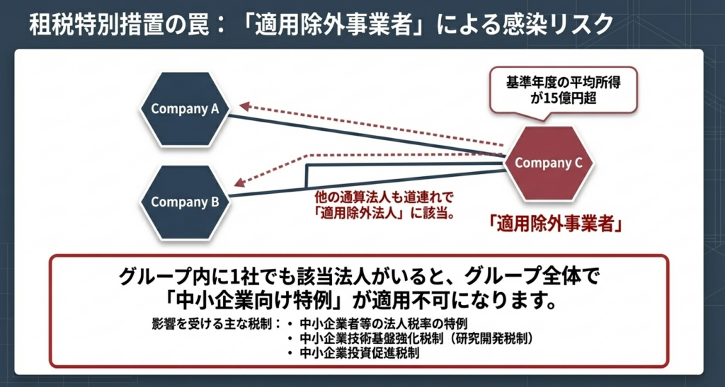 過去3年間の平均所得が15億円を超える「適用除外事業者」がグループ内に一人でもいる場合、グループ全体が租税特別措置法上の中小企業向け特例(研究開発税制、投資促進税制等)の対象外となります。