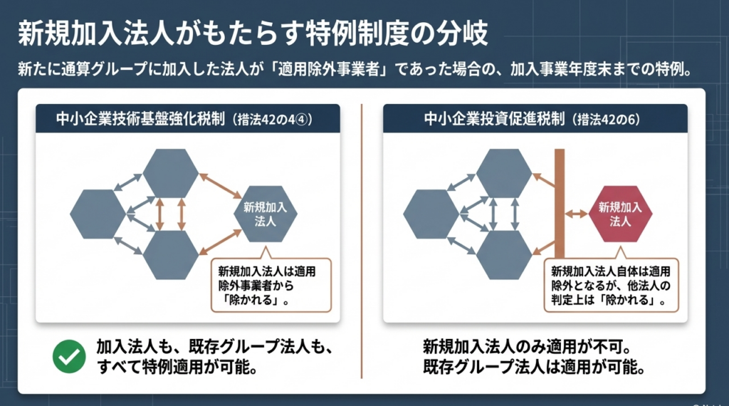 新たに加入した法人が適用除外事業者である場合、研究開発税制等では「その加入法人および他社も適用除外から除かれる」一方で、投資促進税制等では「加入法人のみ適用除外」となるなど、税目によって判定ルールが異なります。この微細な差が実務上の判断を分けます。