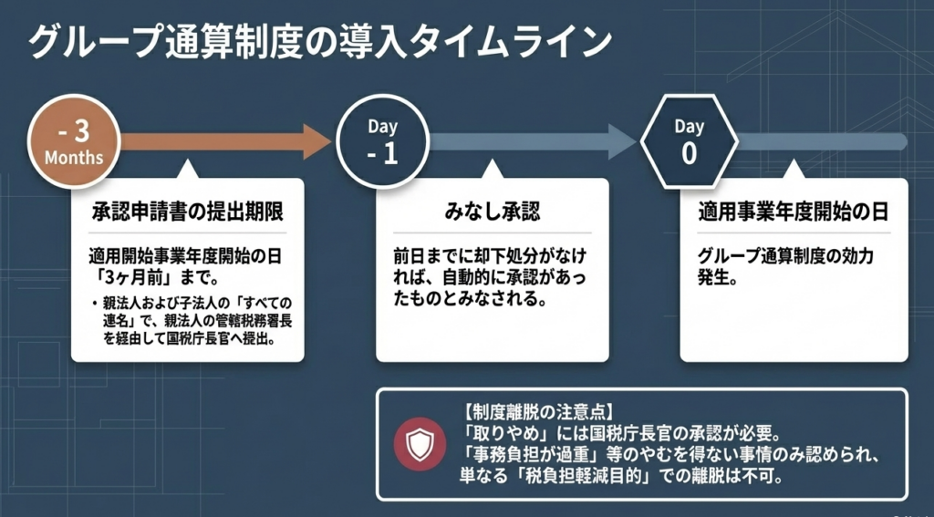 適用開始事業年度の「3ヶ月前」までに、全法人連名での申請が必要です。