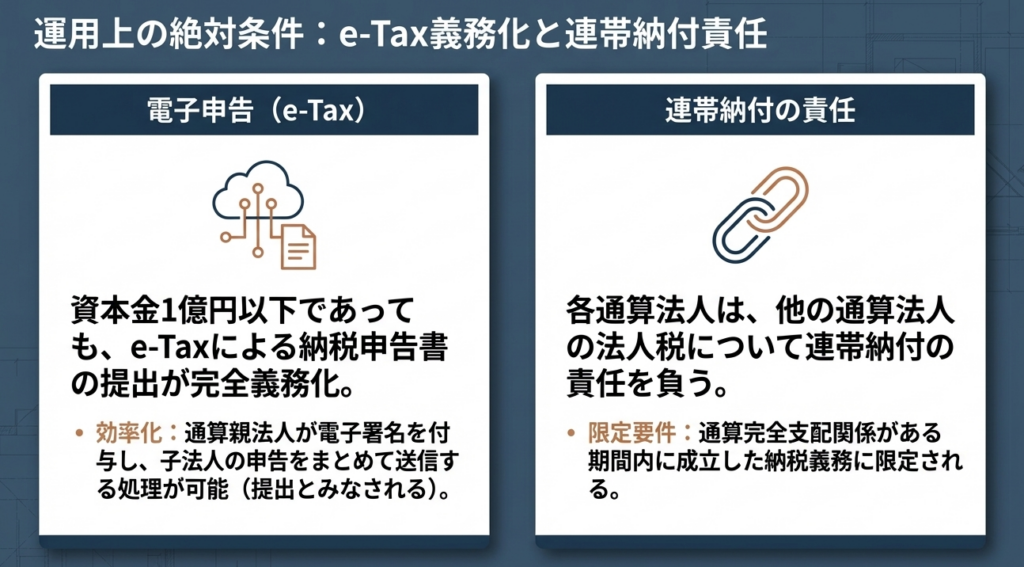 通算法人は資本金規模を問わず、全社e-Tax申告が義務です。実務上の利便性として、親法人の電子署名があれば、子法人の申告書も提出可能である(代理送信の容認)点は、グループ管理において極めて有効な効率化手段です。