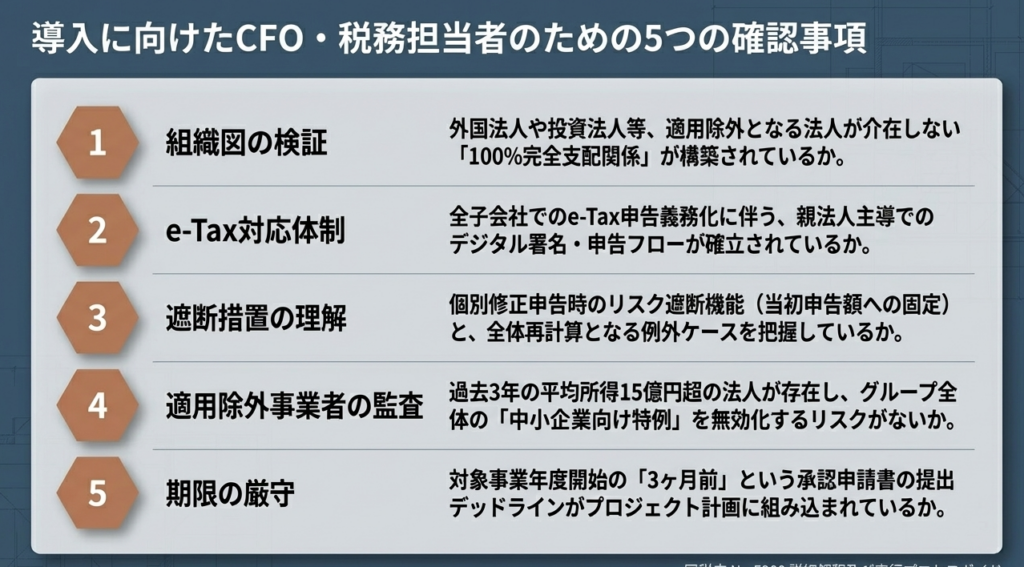 制度適用の成否を分けるのは「完全支配関係」の厳密な判定です。ここでの誤認は、グループ全社の申告を根底から覆すリスクを孕んでいます。