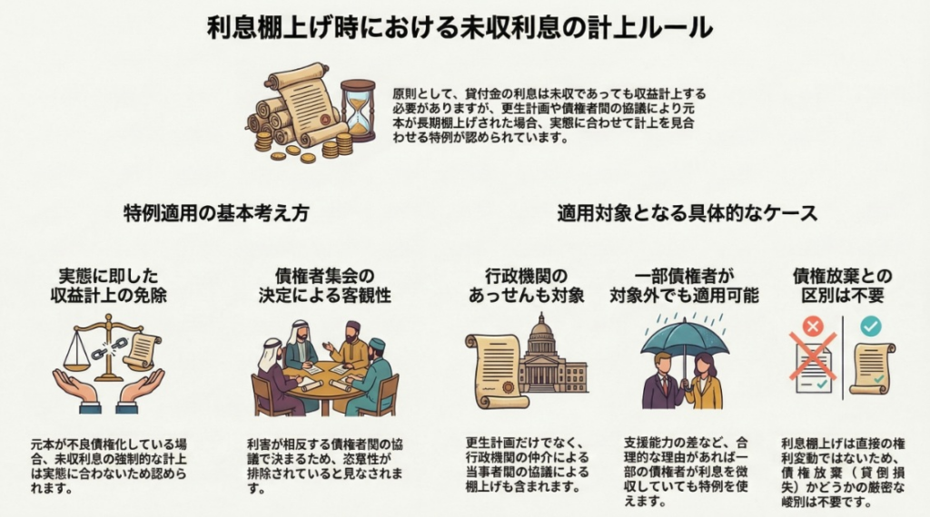 元本が不良債権化した状況で未収利息の収益計上を強制することは実態に合わないため、更生計画の認可や債権者集会の決定等で利息が棚上げされた場合、計上を見合わせる特例があります。