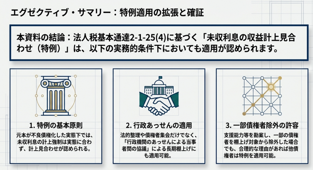 この取扱いは、単なる会計上の主観的な判断ではなく、税務上の「特例」として明確に位置づけられています。発生主義という原則をあえて曲げ、回収の目途が立たない収益への課税を免除している点は、企業の再生プロセスを円滑に進めるための税務当局による合理的な配慮であり、実務担当者はこの特例の意義を正しく評価した上で適用を検討すべきです。