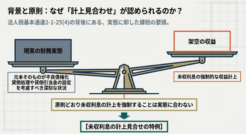 元本そのものが不良債権化し、利息の回収が困難な状況において、原則通り未収利息の計上を強制することは実態に合わないためです。経済的実態を重視した配慮といえます。