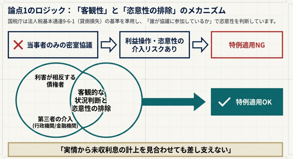 行政機関という第三者が介在して策定された支援策であれば、法的整理に準ずる客観的な事実があると評価され、未収利息の計上見合わせという柔軟な対応が可能になります。