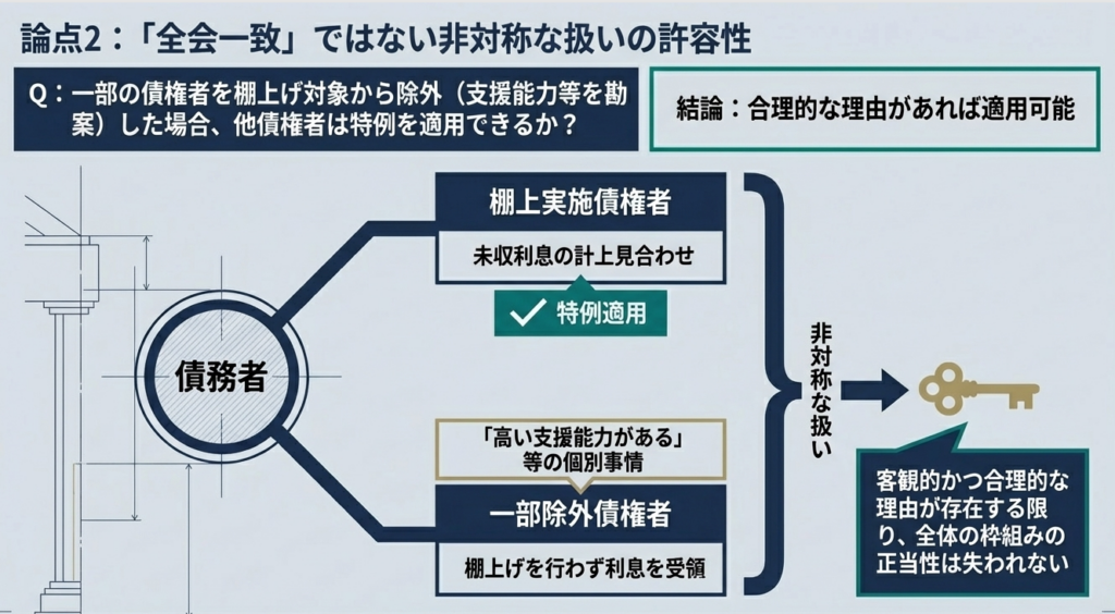 第二に、債権者集会において、支援能力等を考慮して一部の債権者を棚上げの対象から除外した場合でも、その除外に合理的な理由があれば適用されます。利害が相反する債権者間の協議であり、決定に恣意性が入り込む余地がないためです。