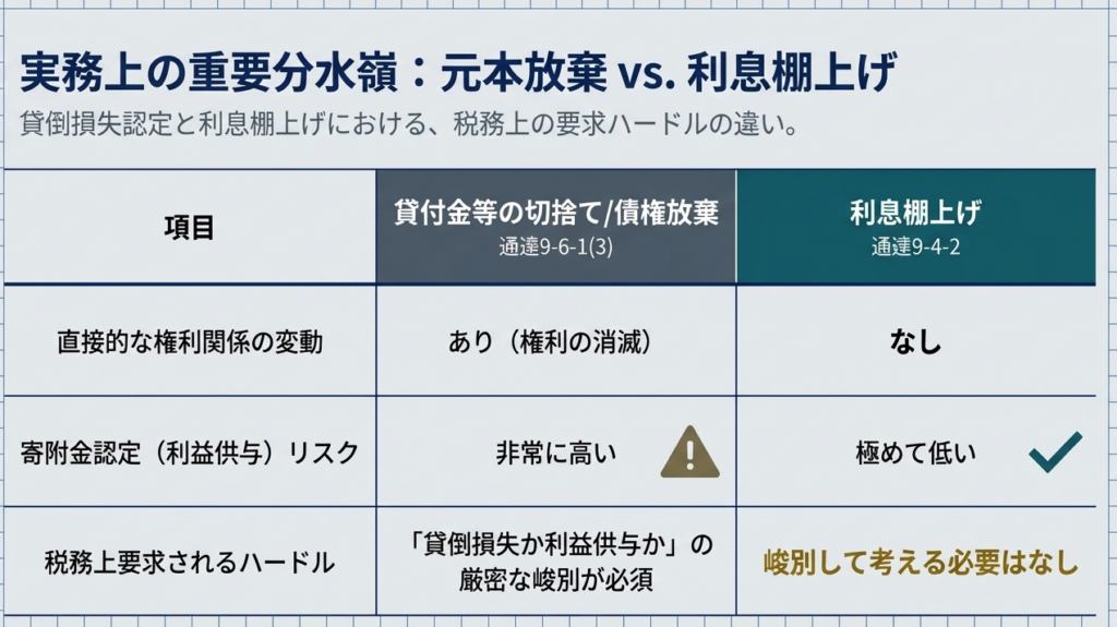 元本カット(債権放棄)の場合、貸倒損失と寄附金の峻別が極めて厳格に求められるが、利息棚上げは「直接的な権利関係の消滅」を伴うものではないため、その点における区分は不要である(国税庁質疑応答事例による)。