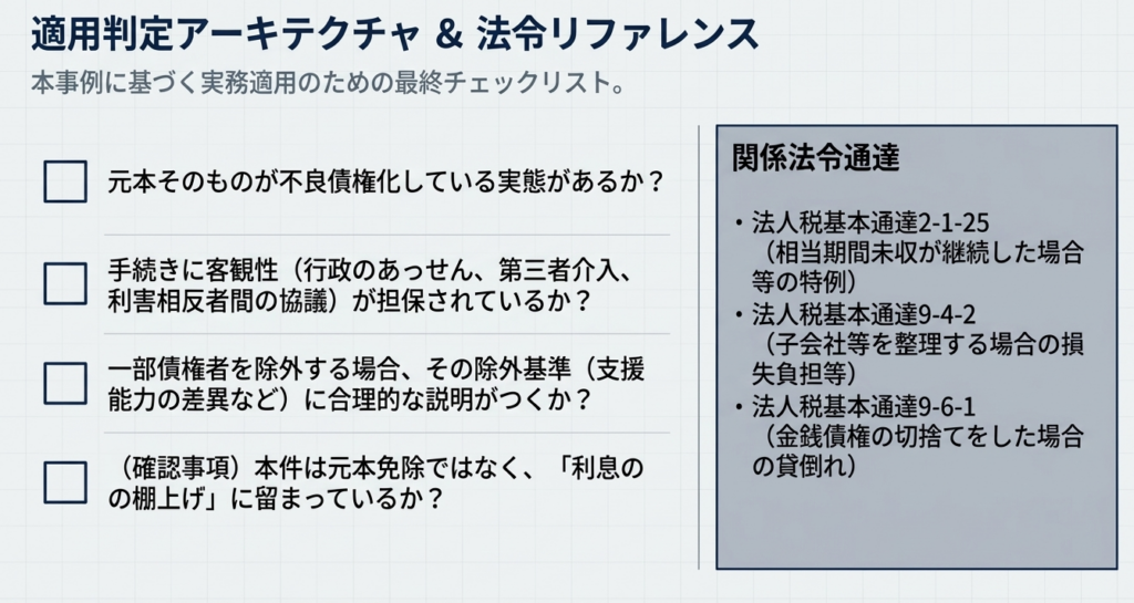 利息の計上見合わせが認められるロジックの根底には、元本債権そのものが「貸倒損失(通達9-6-1)」として切り捨てられるべき状況、あるいは「再建支援(通達9-4-2)」が必要なほど毀損しているという認識があります。