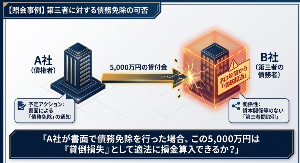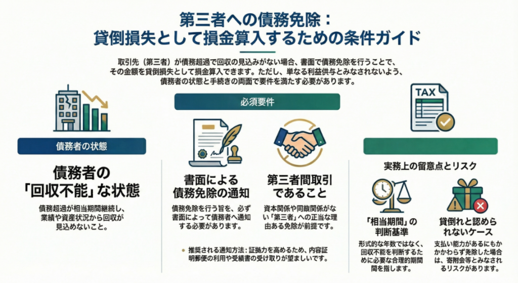 通達に基づき、「債務者の債務超過の状態が相当期間継続」しており、かつ「弁済を受けることができないと認められる」場合に、書面で意思表示を行うことで損金算入が認められます。 - 「第三者間取引」が持つ実務上の重み: