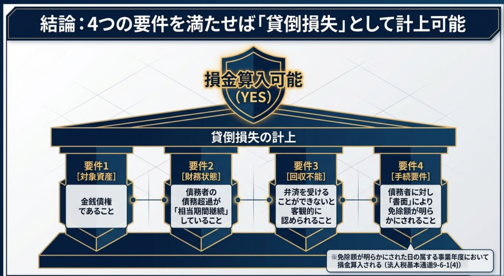 債務者の債務超過の状態が相当期間継続し、金銭債権の弁済を受けることができないと認められる場合に、書面によって債務免除を行うことが要件となります。この際、債権の回収可能性を十分に検討した上での判断であることが求められます。