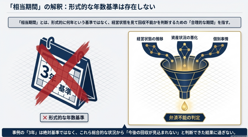 | 相当期間 | 形式的な年数ではなく、回収不能を判断するために必要な合理的かつ個別事情に即した期間。 |