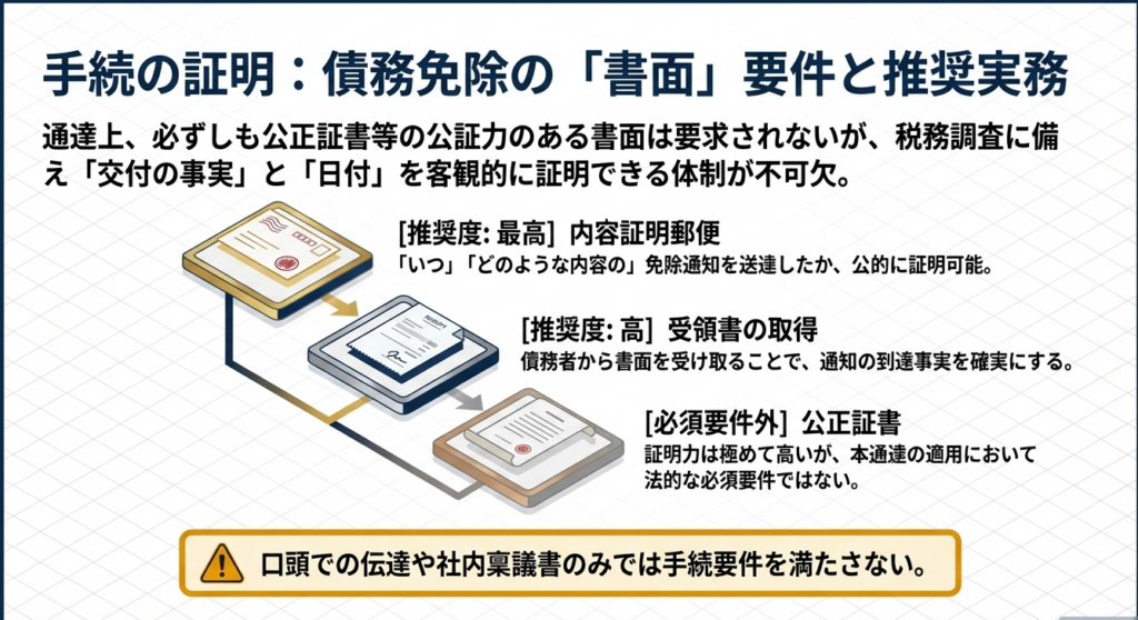 債務免除の事実は、必ず「書面」で明らかにする必要があります。実務上、公正証書などの公証力までは求められませんが、税務調査において「いつ、誰に、いくら免除したか」を確実に証明するため、「内容証明郵便」による送付、あるいは債務者からの記名押印がある「受領書」の回収が強く推奨されます。
