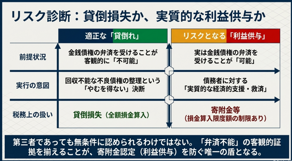 ただし、ここでプロとして強調しておきたいのは、「第三者間であれば無条件に貸倒れが認められるわけではない」という点です。