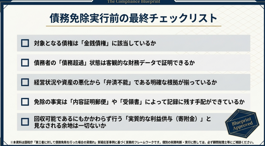 税務当局が最も注視するのは、その免除が「真に回収不能によるものか」あるいは「意図的な支援か」という点です。