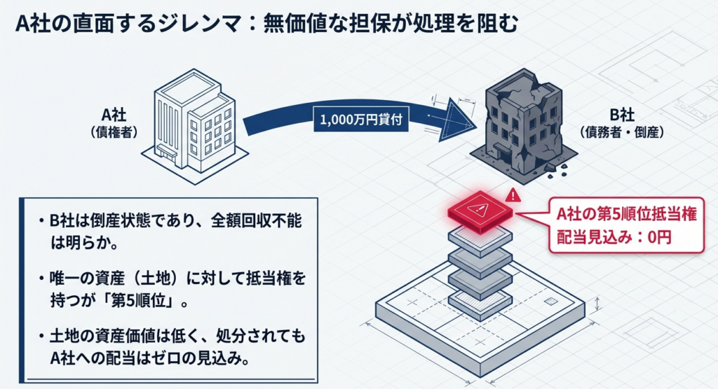 担保物の適正な評価額に照らして、先順位の抵当権等により配当の見込みが全くなく、実質的に債権を保全できていない状況を指します。本事例のように第5順位で資産価値が低い場合などがこれに該当します。